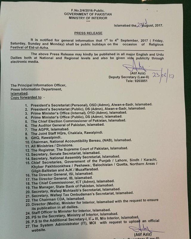 Notification For Holidays of Eid-ul-Adha By: Ministry of Interior 1st to 4th September, 2017