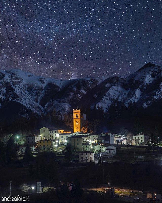 Bellissima vista notturna del piccolo Borgo di Chiozza, 910 mt di altezza, sullo sfondo le montagne innevate dell' Appennino Tosco-Emiliano! ❄????❄????❄????❄????❄????❄
