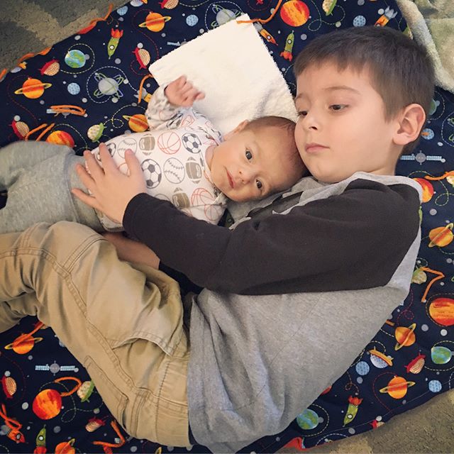 Bronco has taken to his role as big brother so much better than we even imagined he would. He loves Hudson with a fierce (and sometimes a very literal “fierce” when he’s smothering him with kisses, haha) love. Today I walked in the room to find him holdin