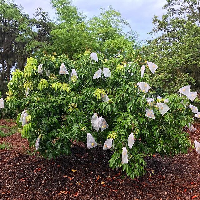 Sweetheart Lychee fruit partially bagged. Tree has another 1/3 of the fruit which is still quite small that will be bagged later. The birds seem to eat the fruit as soon as it turns red, so we bag it at the first sign of color change. There are plenty of