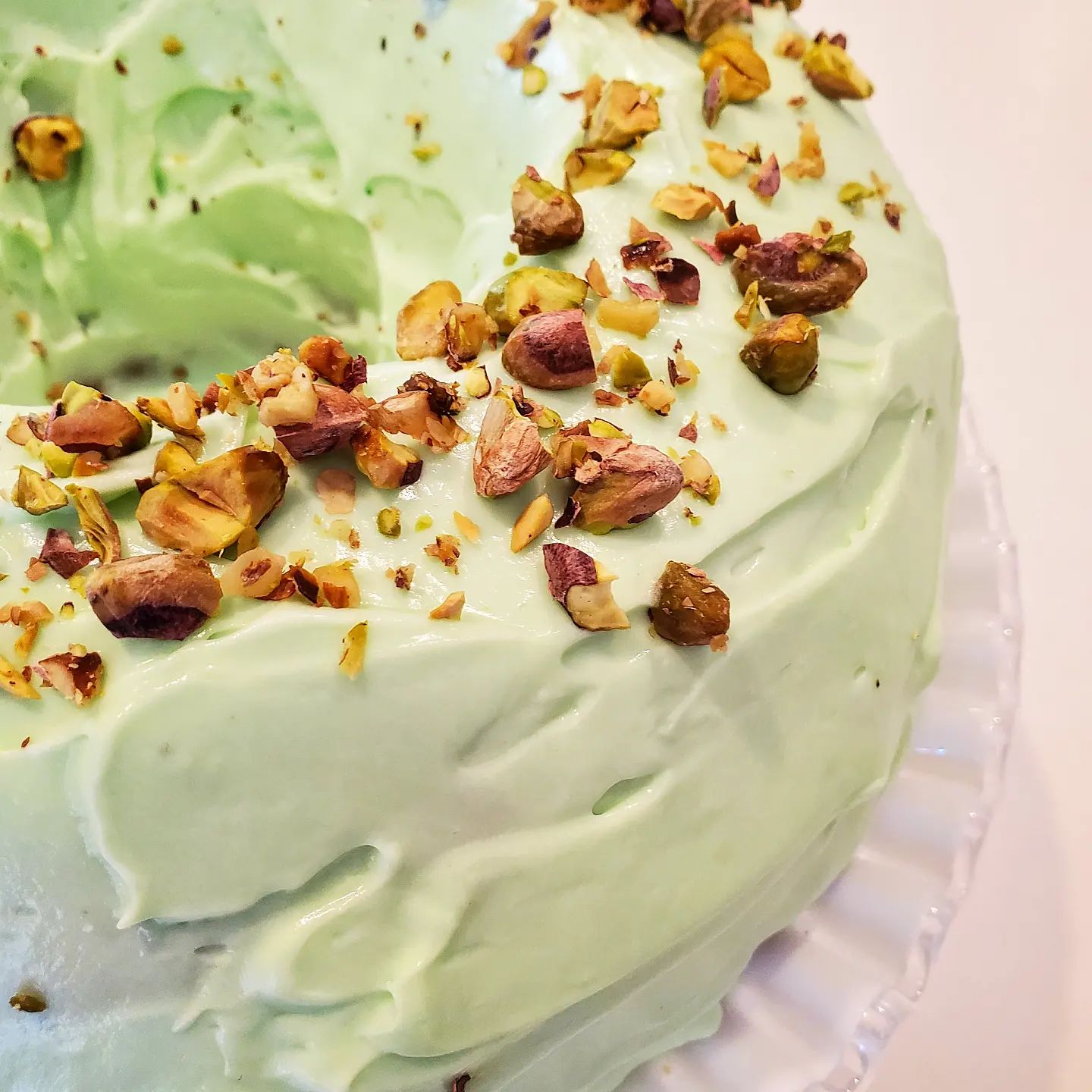Another throwback recipe. A 70s Watergate cake with pistachio icing in service of our early St. Patty's Day family dinner.