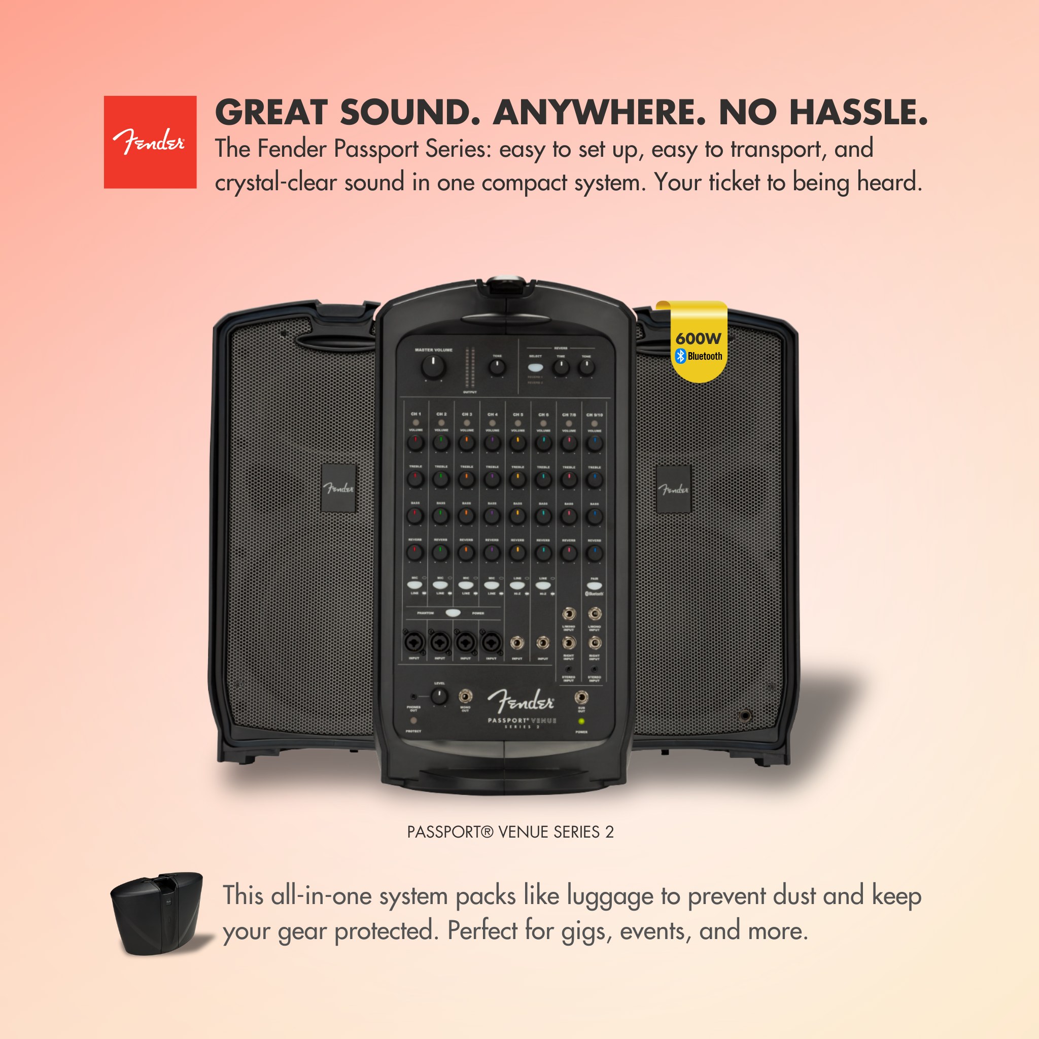 The Fender Passport Series makes it simple. Easy to set up. Easy to transport. Crystal-clear sound in one compact system. From gigs to gatherings, it’s your ticket to being heard.