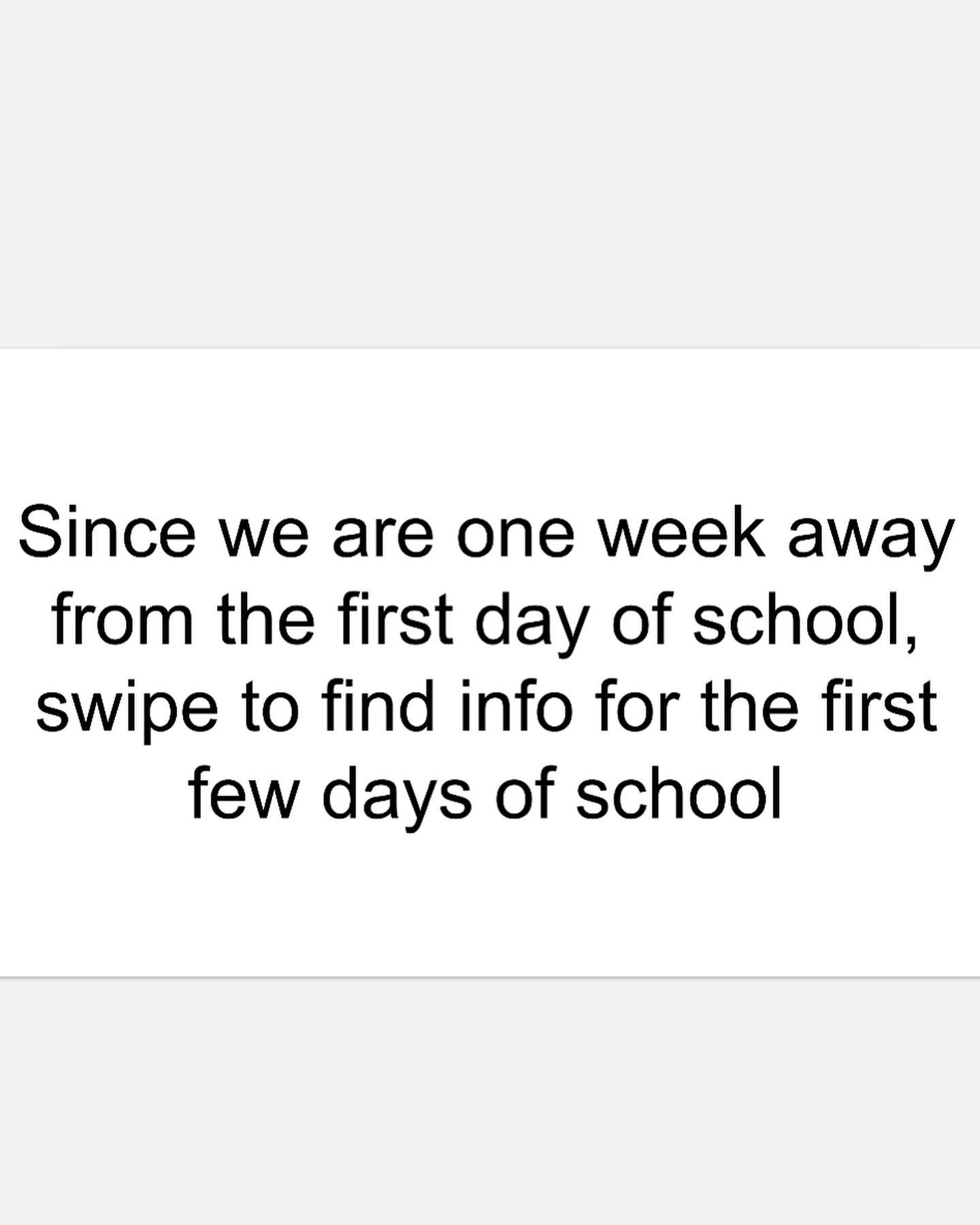 The first day of school is only a week away! We are getting so excited to see our returning students and meet our incoming ones! Swipe to see some helpful information for the first few days of school and if you have any other questions send us a message!