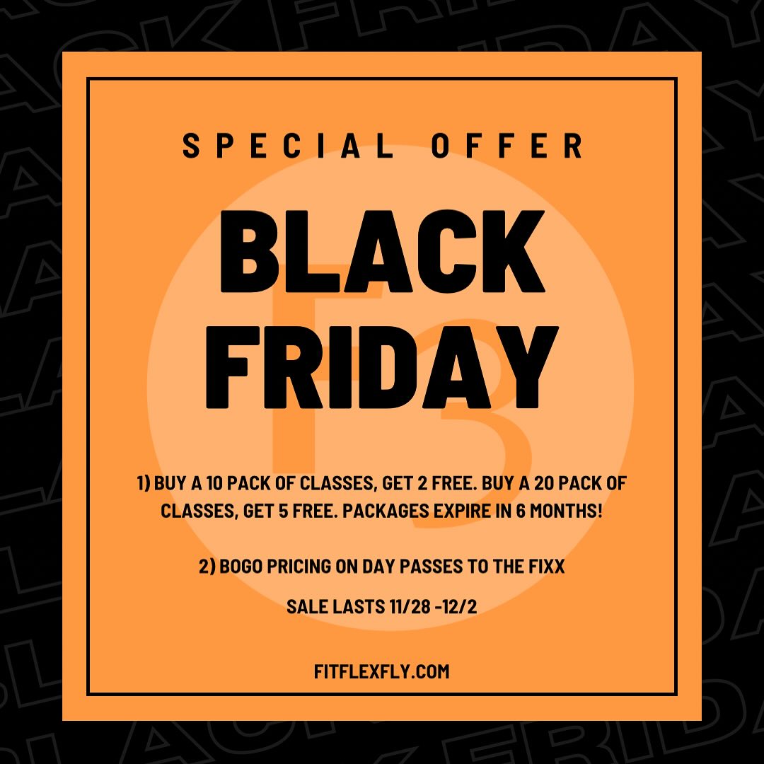 Black Friday deals at F3 are here! Check out our class pack specials or BOGO to The FIXX now through cyber Monday (12/2). Come visit us, give us a call