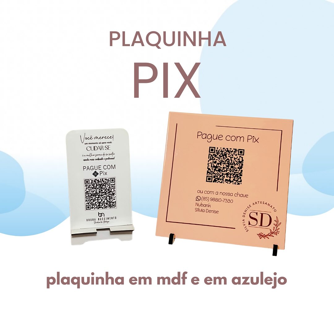 “Facilite seus recebimentos com estilo! Nossas plaquinhas de PIX personalizadas são a maneira perfeita de mostrar suas informações de pagamento de forma prática e atraente. Com design exclusivo, você pode incluir seu nome ou o nome da sua marca, tornando