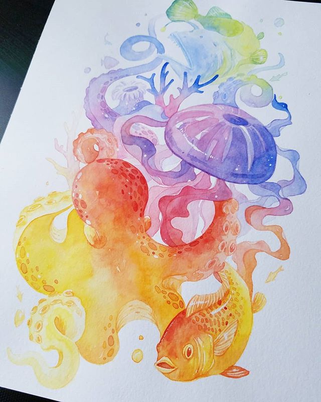I'm super happy with this #rainbow color :) this painting of #seacreatures reminds me of taking art lesson when I was a kid in China. My first assignment was painting fish and ocean. Chinese education system is very good at turning fun into misery, let's