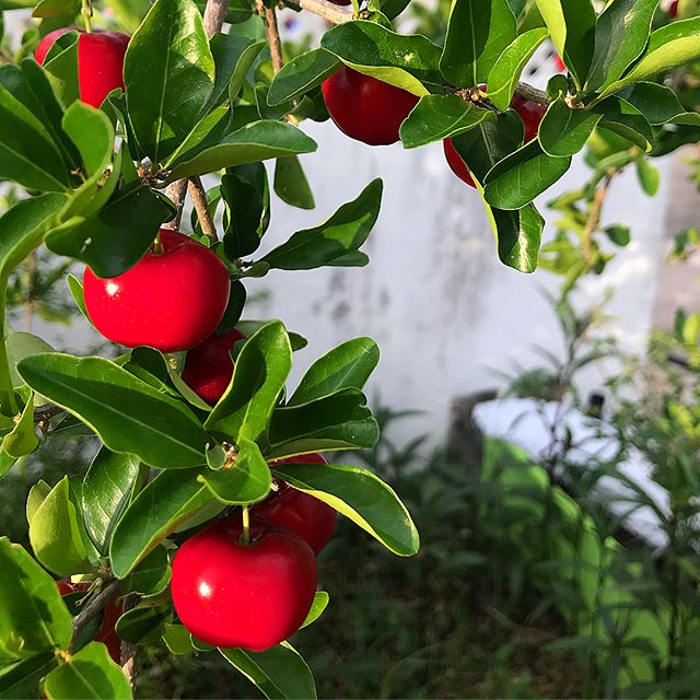 Barbados Cherries are so pretty. This variety is called Florida Sweet and is a bit sweeter than other varieties, especially when very ripe. We propagate ours by cuttings.