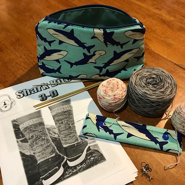 Great start to Shark Week 2018 ???? Cast on my shark socks while wearing my shark socks from last year (designed by the jawsome @spinninglara ) while watching Shaq on tv, my son with a stuffed shark and wearing fun new shark earrings from my mom! #sharkwe