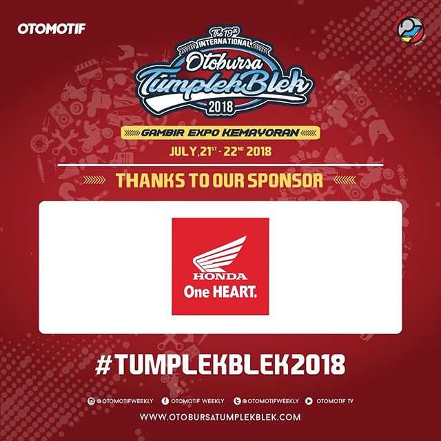 Otobursa Tumplekblek 2018 telah terselenggarakan pada tanggal 21 - 22 Juli 2018 di Gambir Expo Kemayoran berkat kehadiran sponsor kami, yaitu : 1. Honda Prospect Motor 2. Suzuki Indomobil 3. Yamaha Motor Indonesia 4. Mitsubishi Motor 5. Pertamina Lubrican