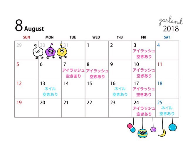 . 8月1日〜25日までの アイラッシュ、ネイルの空き状況です! お盆前は大変混み合っておりますので 早めのご予約をお勧めします♪ ご来店お待ちしております☺︎