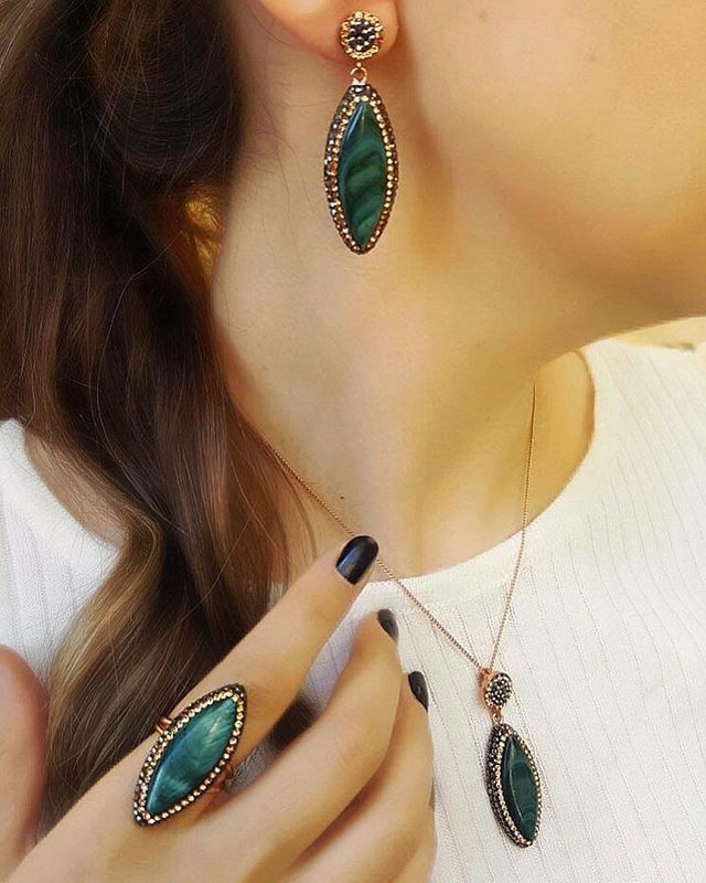 ????Yeşil Sedef Kenar Taşları Zirkon İşlemeli El Yapımı ve Gümüş Takı Seti????