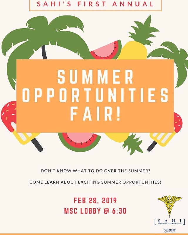 Hello, fellow Emory students! Are you interested in getting involved with an amazing and insightful summer opportunity? Well, if so, please come out to SAHI's Summer Opportunities Fair event on Thursday, February 28th at 6:30 PM in the MSC Lobby! We will