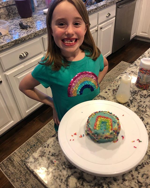 So proud of her first cake! She didn’t even mean to match her shirt ????