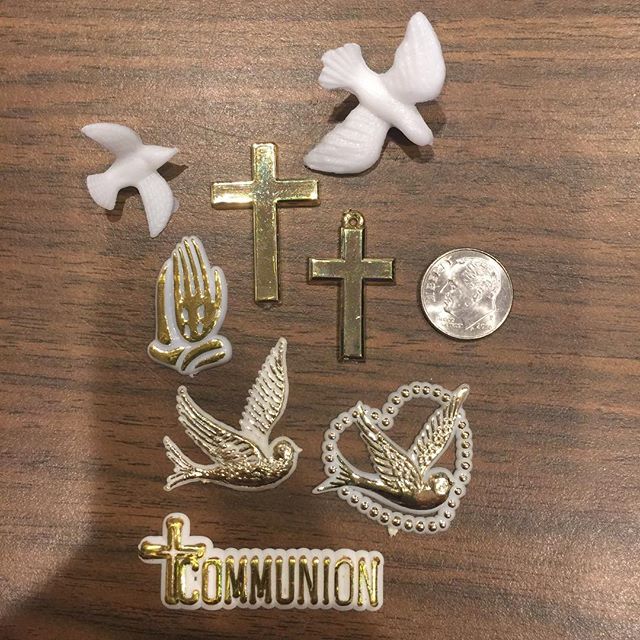 It’s that time again. Plenty of stock for your communion favor needs. Other designs available too. (Dime used to show scale)