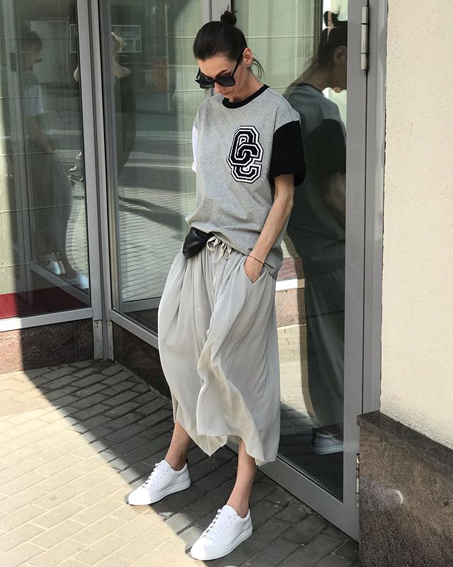 Образ дня: шёлковая юбка KRISTENSEN DU NORD, футболка OPENING CEREMONY, поясная сумка GABRIELE FRANTZEN, кеды JOSEPH ????