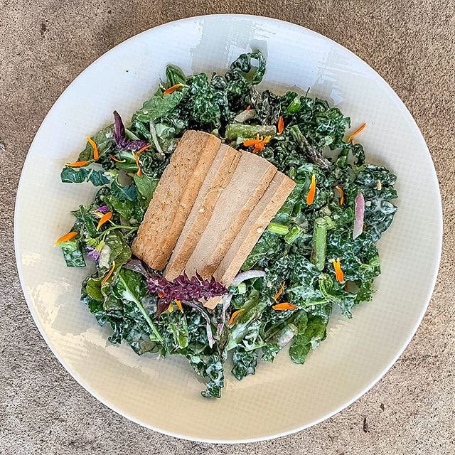 My sister makes the best salads, the secret is in the dressing: she's heavy handed on flavor. Here, a creamy cashew dressing with various greens from the garden, tender asparagus (raw), edible flowers such as calendula and purple basil, pumpkin seeds for