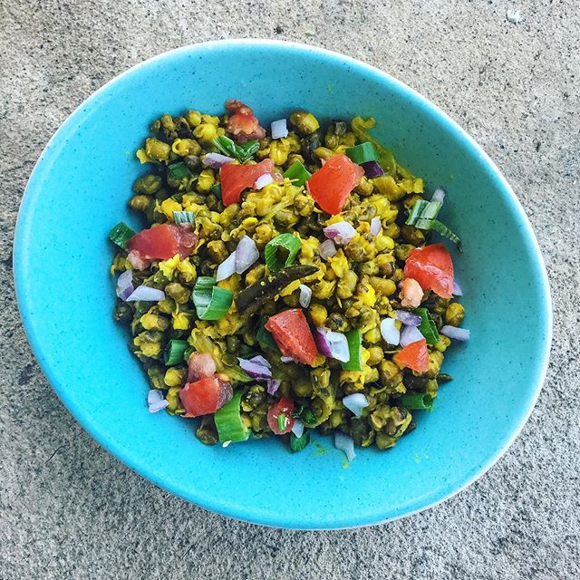 Here's my mom's Sprouted Mung salad. I've been eating this since I developed teeth! Whole green mung beans are sprouted for 2-3 days and then boiled until tender and spiced with dried mango powder, turmeric, cumin seeds, salt and sautéed onion. I love add