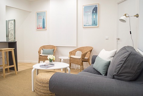 Del recibidor con papel de palmeras, pasamos al salón- cocina y su “antes y después “.