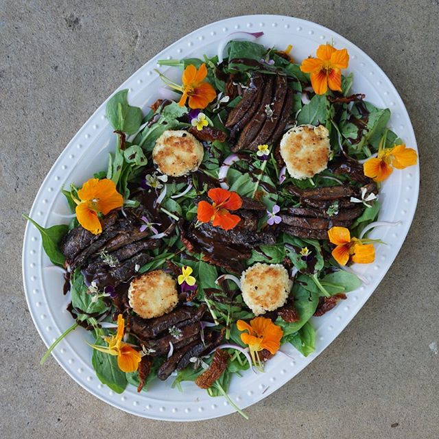 Grilled portobello mushroom, sundried tomatoes and breaded goat cheese salad on a bed of baby spinach and sprouted green lentils and dotted with nasturtiums from the garden for a sharp bite from their delicate petals. Violas, thyme and arugula flowers als