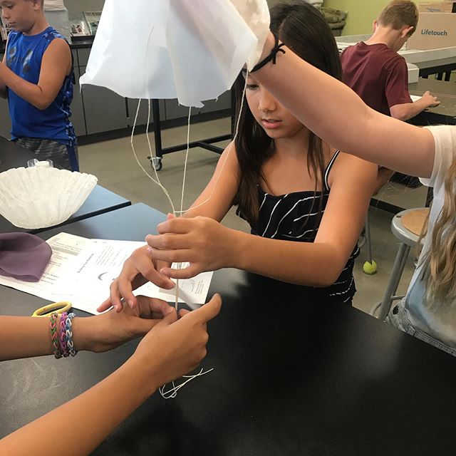First day of parachutes! Different groups will be testing for variables that include size of canopy, material of canopy, and length of suspension lines. Check back tomorrow to see our results!