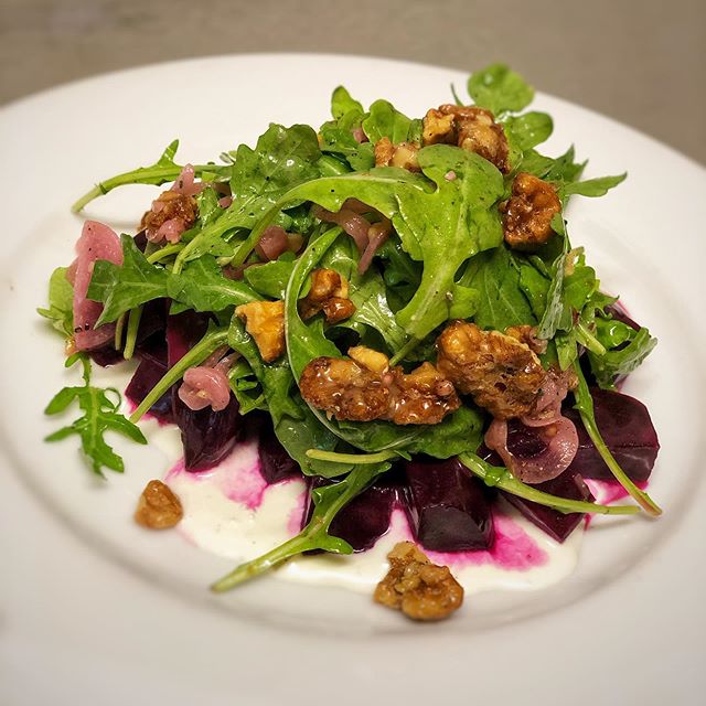 You can’t ‘beet’ this...GPB’s Beet Salad. Pickled beets on a bed of goat cheese with arugula topped with candied walnuts. ???? | For reservations, ☎️ 703-888-1920 or go to greenpigbistro.com #greenpigbistro #beets #salad #summer