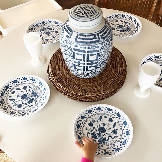 Little hands welcome! ???????? Can you believe these are kid safe melamine plates that can go in the dishwasher? No mix of primary colors on this dinner table thanks to @courtlandandco So happy with this purchase! #blueandwhite #kidfriendlydesign