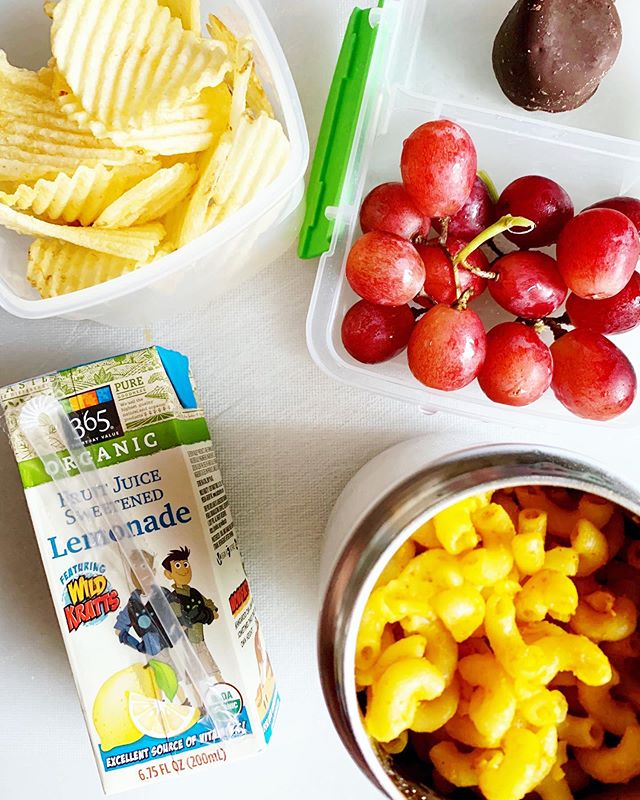 Just a “weird,” vegan school lunch. ???? Nothing to see here. ???? Chips ????grapes (I cut Jonny’s in half, this is David’s lunch) ???? homemade mac and cheese ???? lemonade ????????and a @betterbites_bakery cookie dough bite ???? Plus a @gomacro bar and