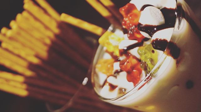 甘く香ばしいなめらかな味わいのカカオミルクに、ポッキーとチョコソースのかかったマシュマロ、さらにカラフルなHARIBOグミまでトッピングされた可愛らしいミルクカクテルです????